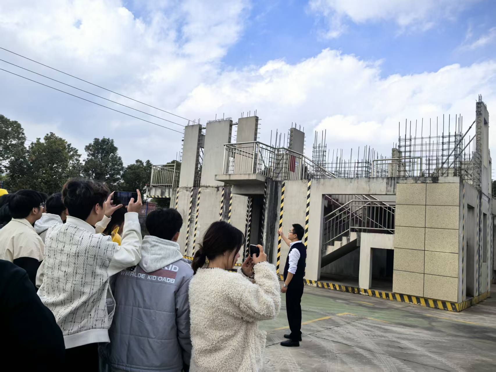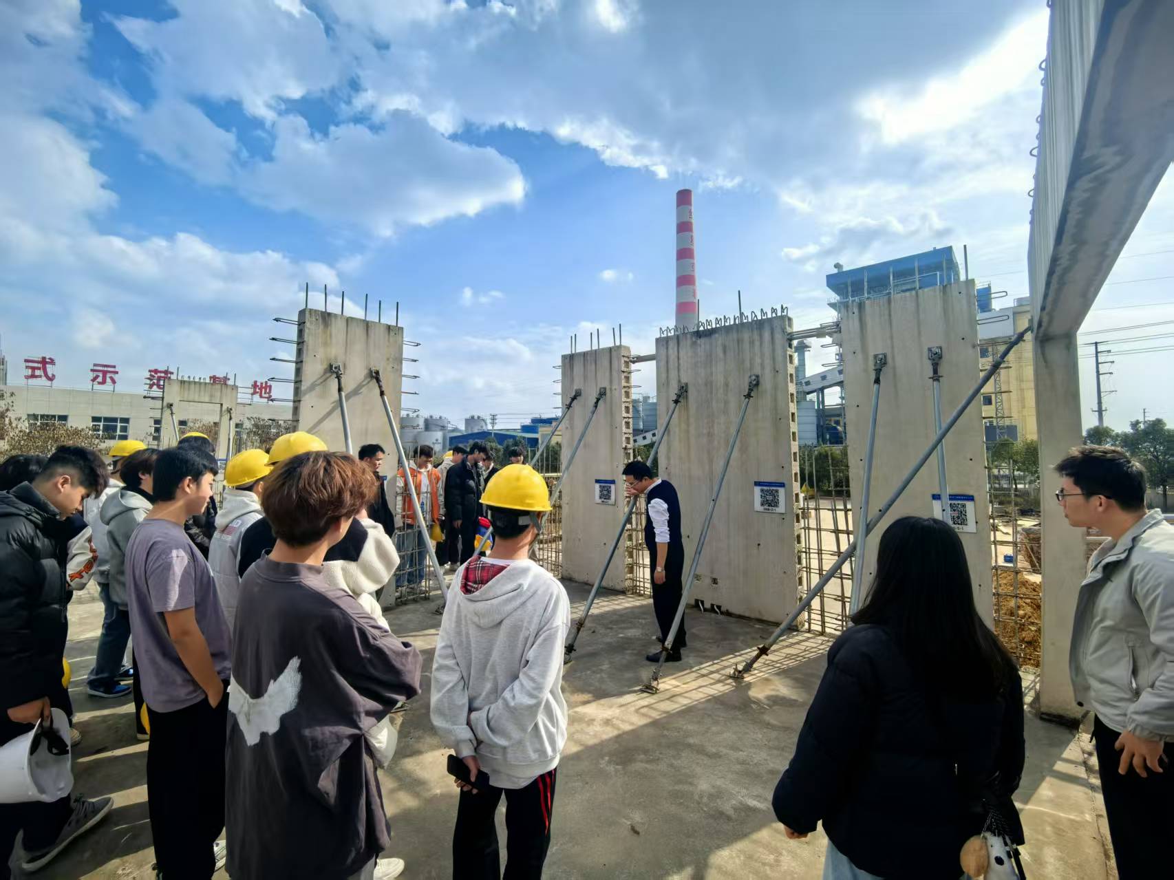 在预制构件堆放场地,现场整齐码放的楼梯板、叠合板等各类构件引发学生浓厚兴趣。技术人员结合实物,介绍常用构件的类型、规格参数及适用场景,学生围绕构件耐久性、拼接工艺等问题深入交流,直观理解了标准化生产理念。