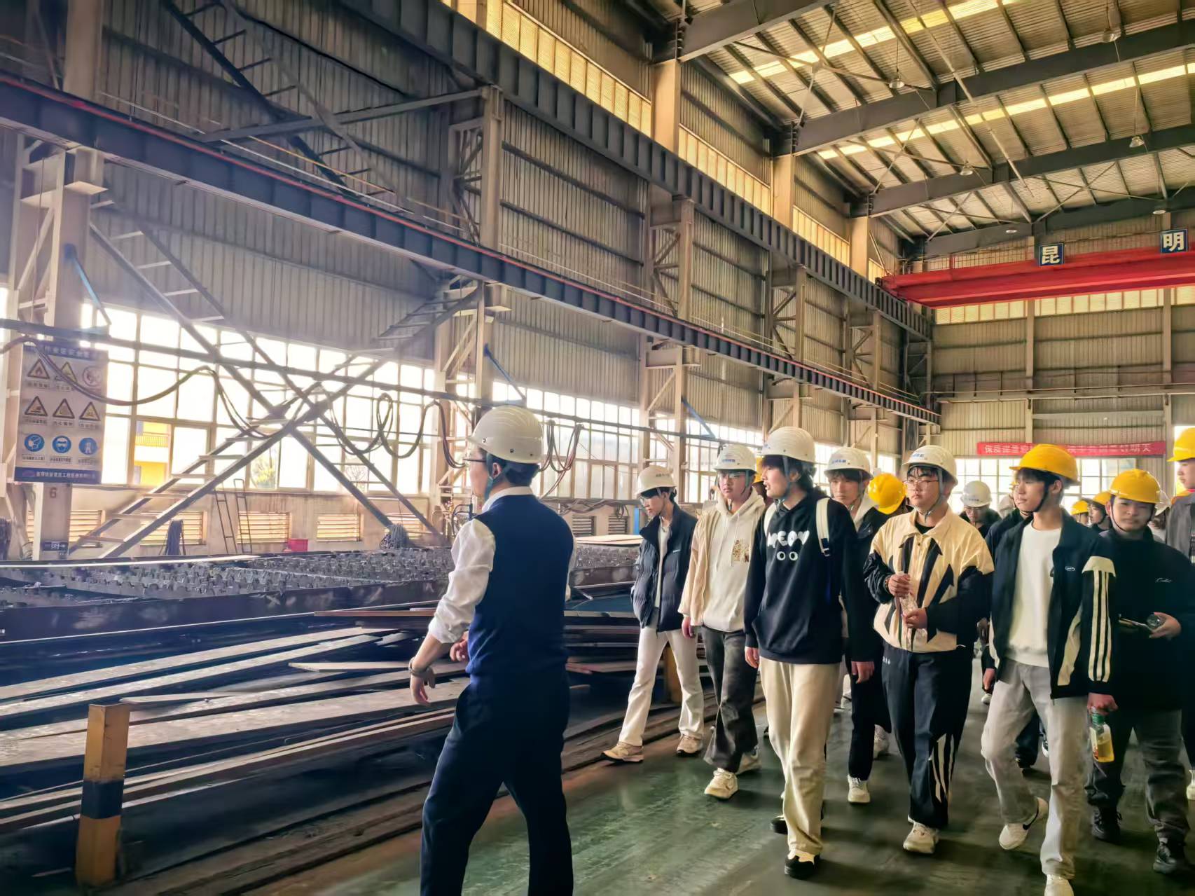 在生产厂房,师生们认真观摩钢结构和混凝土预制构件完整生产流程。技术人员详解智能布料机、蒸汽养护系统等核心设备的原理与操作,分享行业创新趋势,学生认真记录并积极请教,学习氛围浓厚。