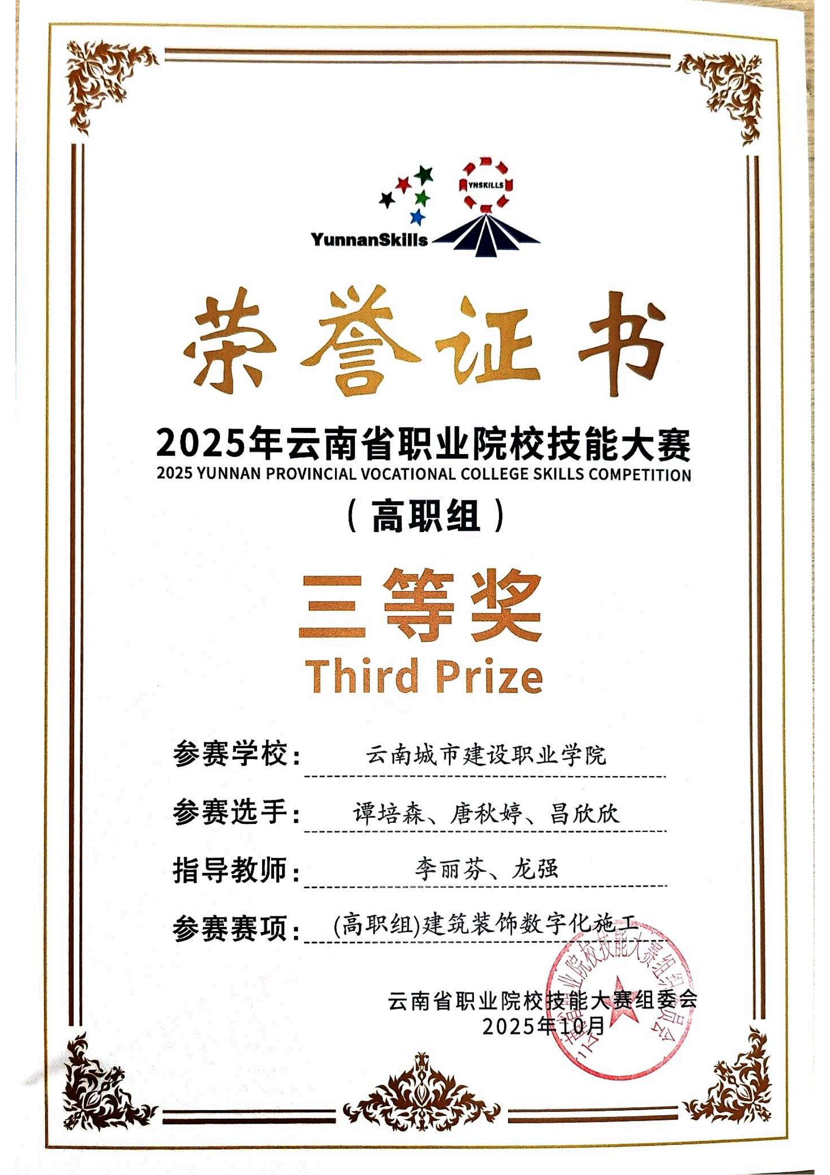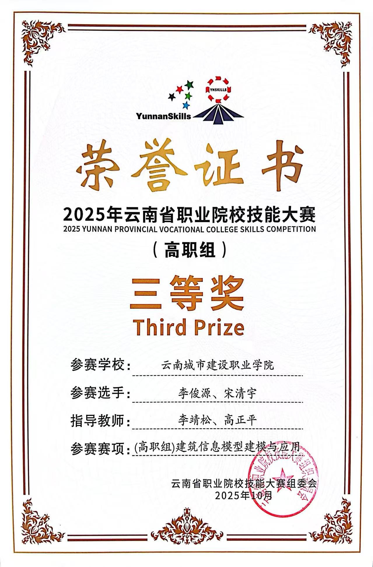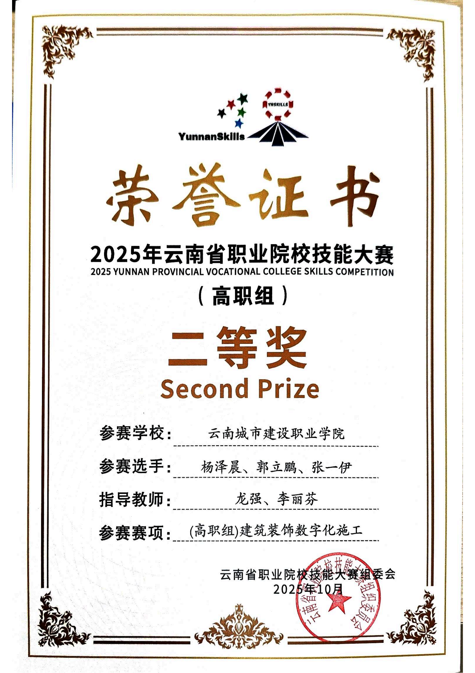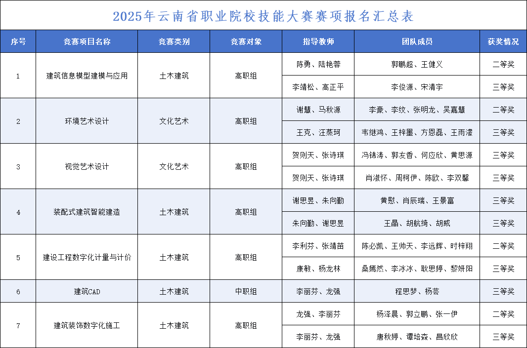 近日,2025年云南省职业院校技能大赛落下帷幕,在云南城市建设职业学院新视界设计产业学院、鲁班智能建造产业学院的支持下,学校数智城市学院参赛团队师生斩获二等奖4项,三等奖9项,实现学校在新兴技能领域的突破。