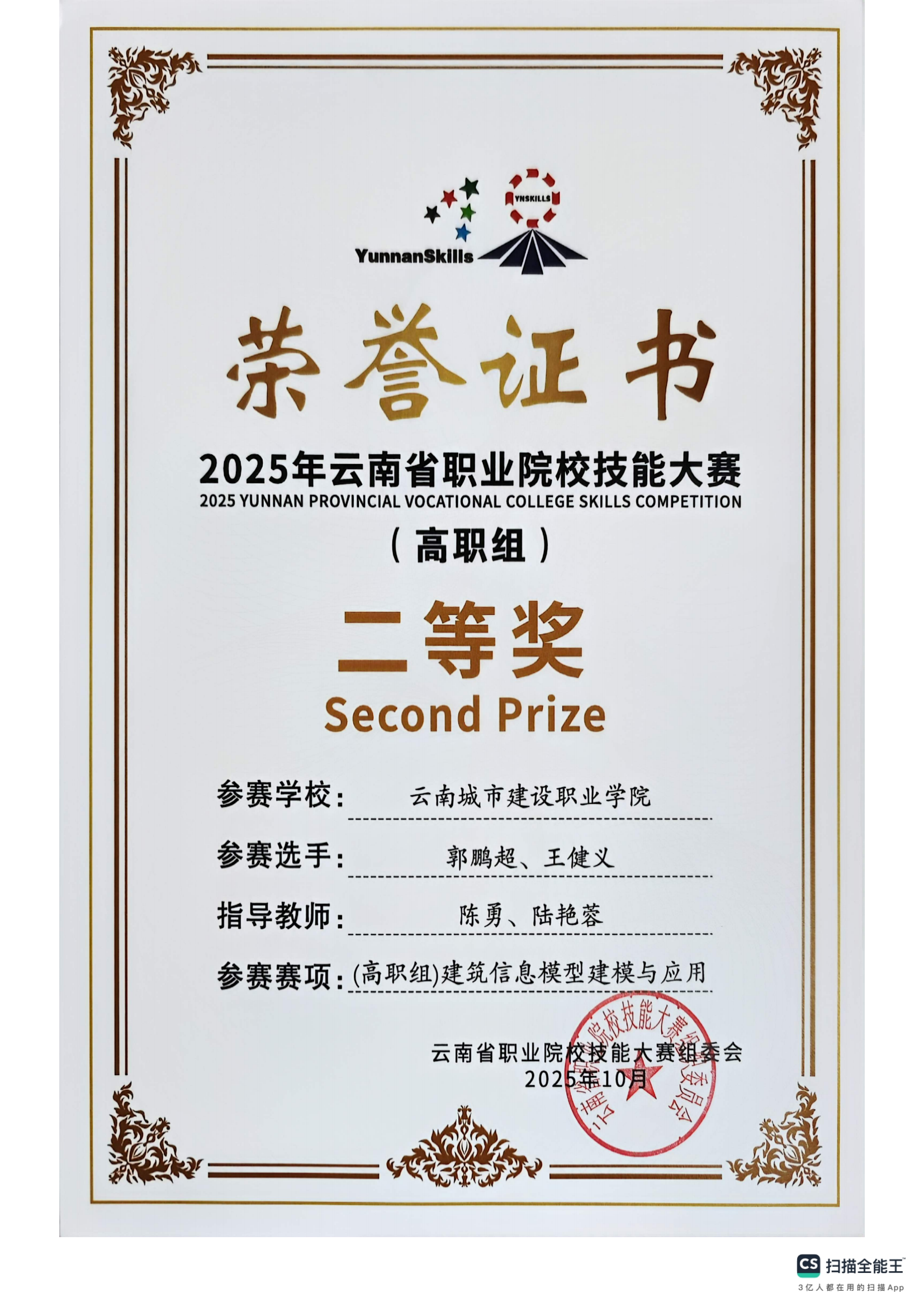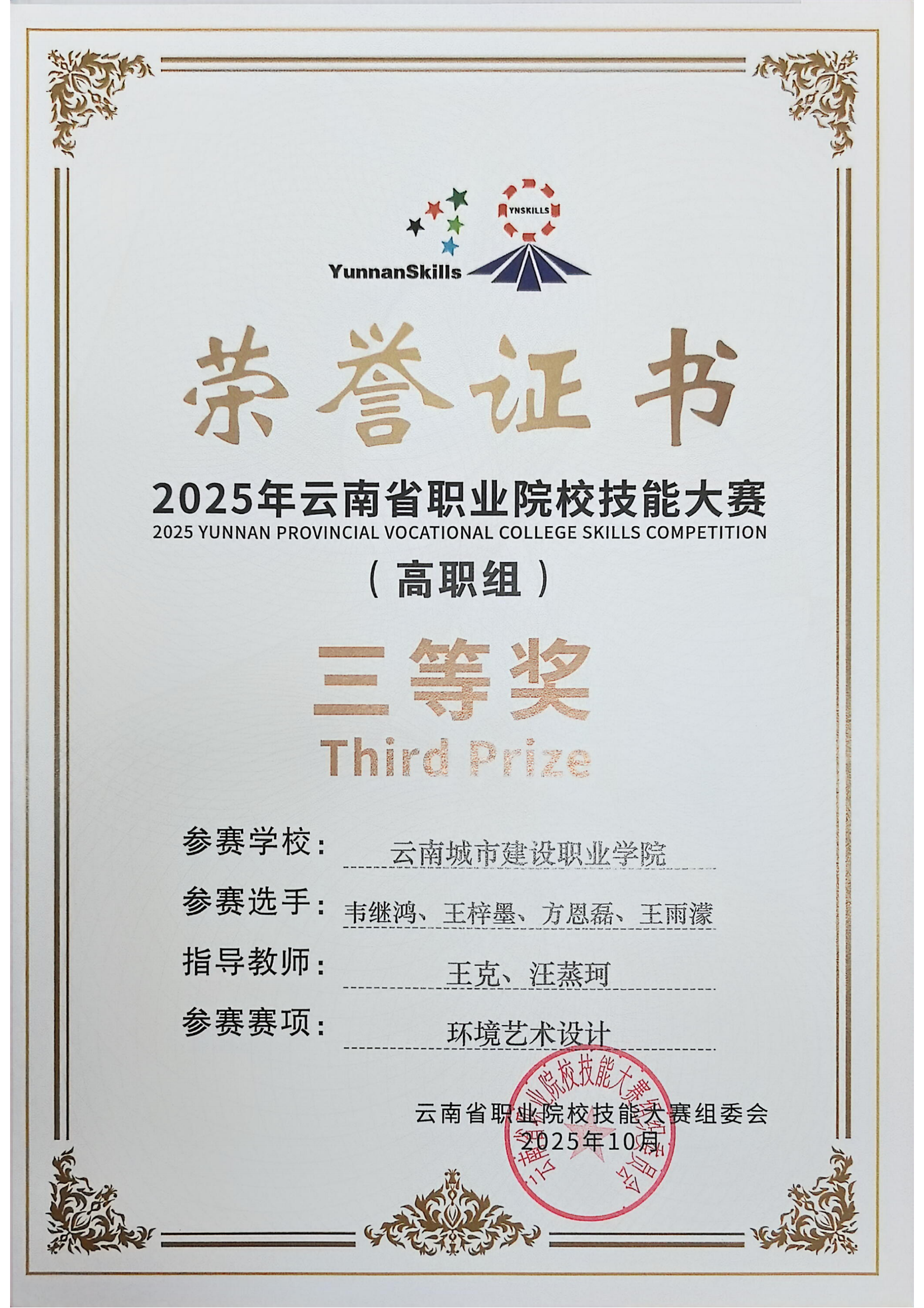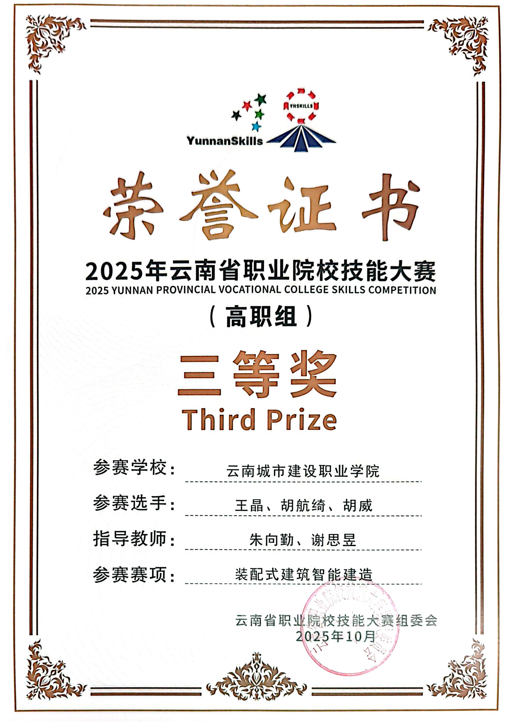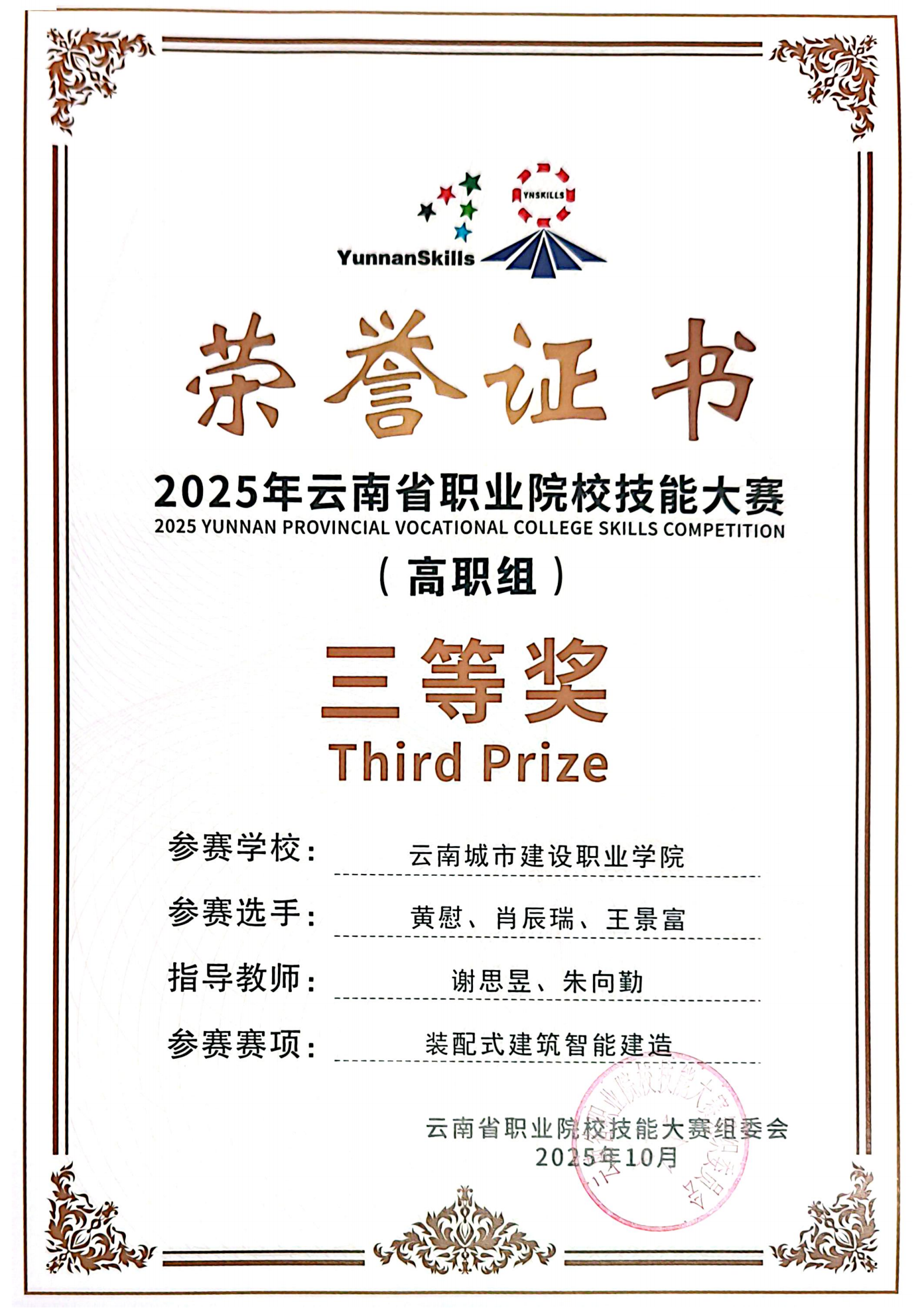 近日,2025年云南省职业院校技能大赛落下帷幕,在云南城市建设职业学院新视界设计产业学院、鲁班智能建造产业学院的支持下,学校数智城市学院参赛团队师生斩获二等奖4项,三等奖9项,实现学校在新兴技能领域的突破。