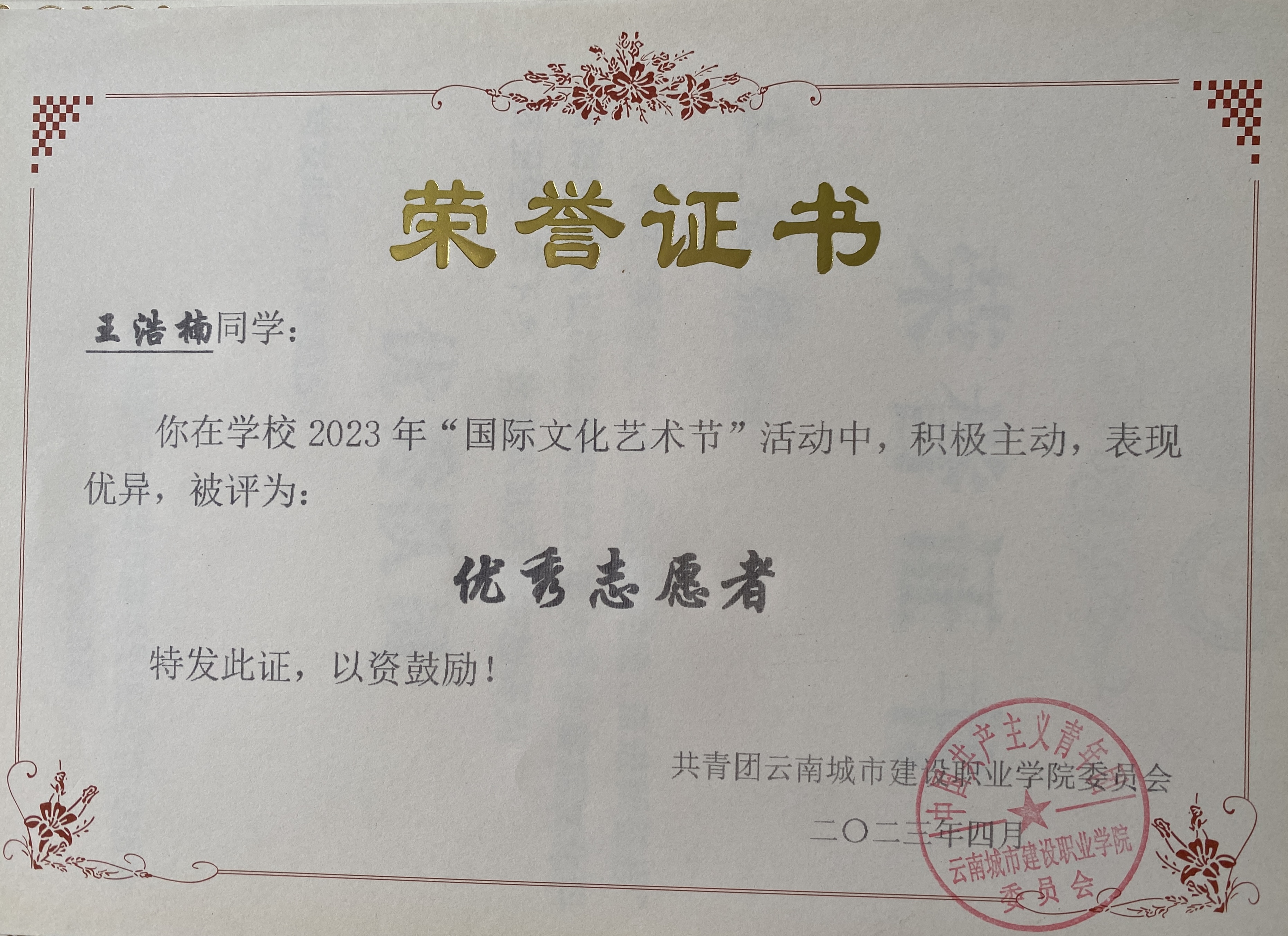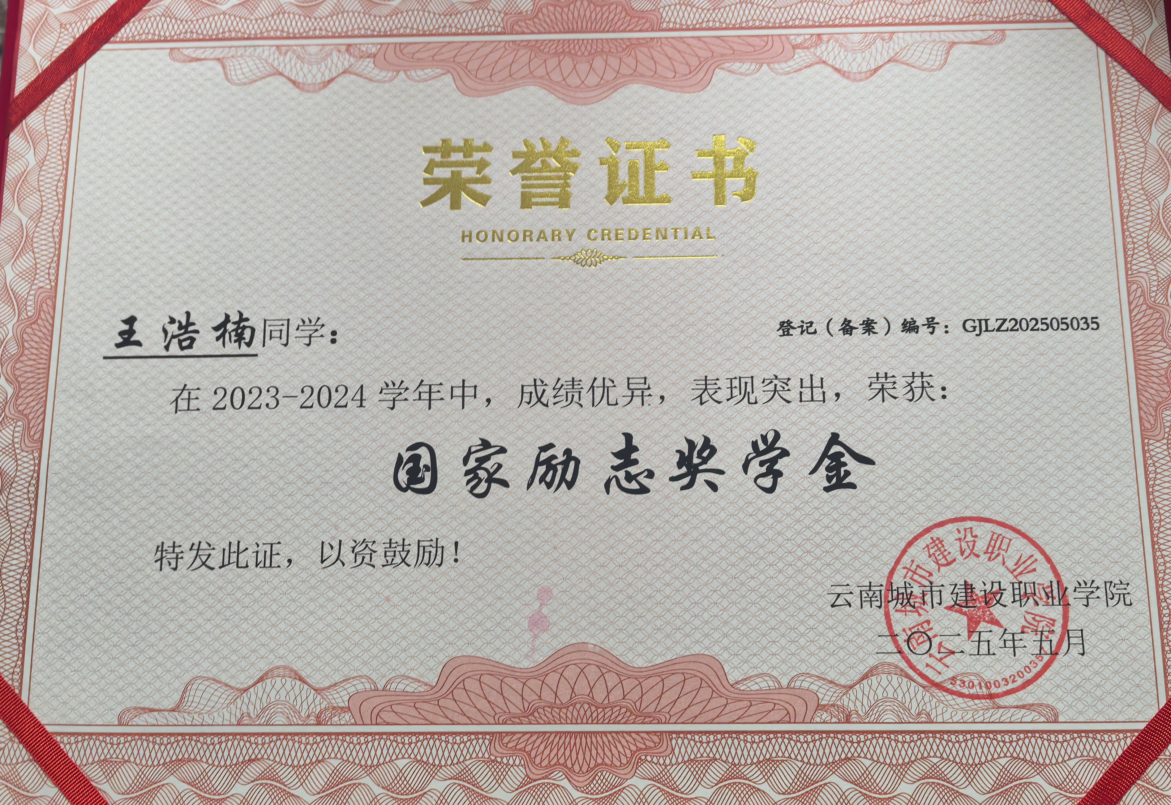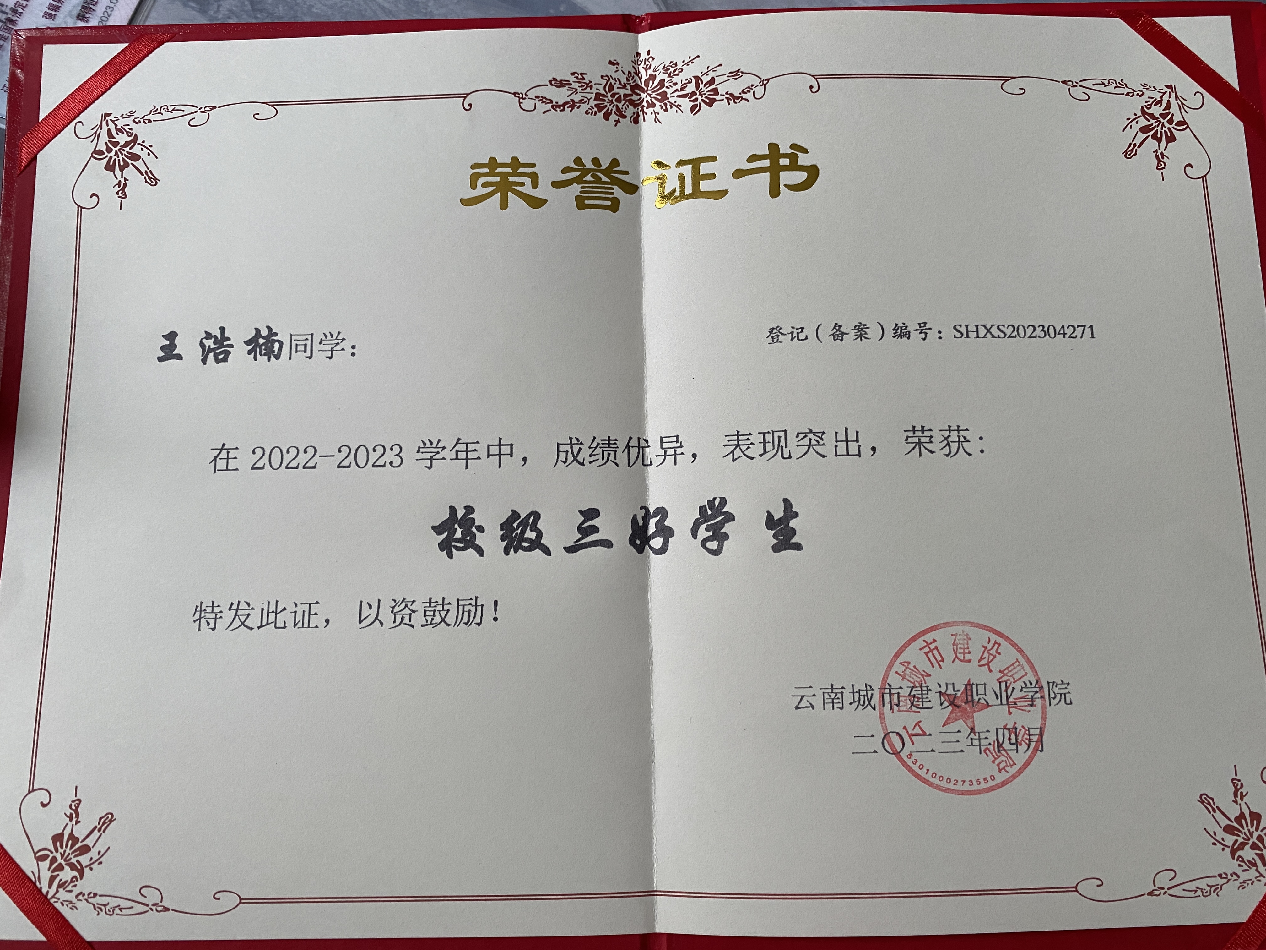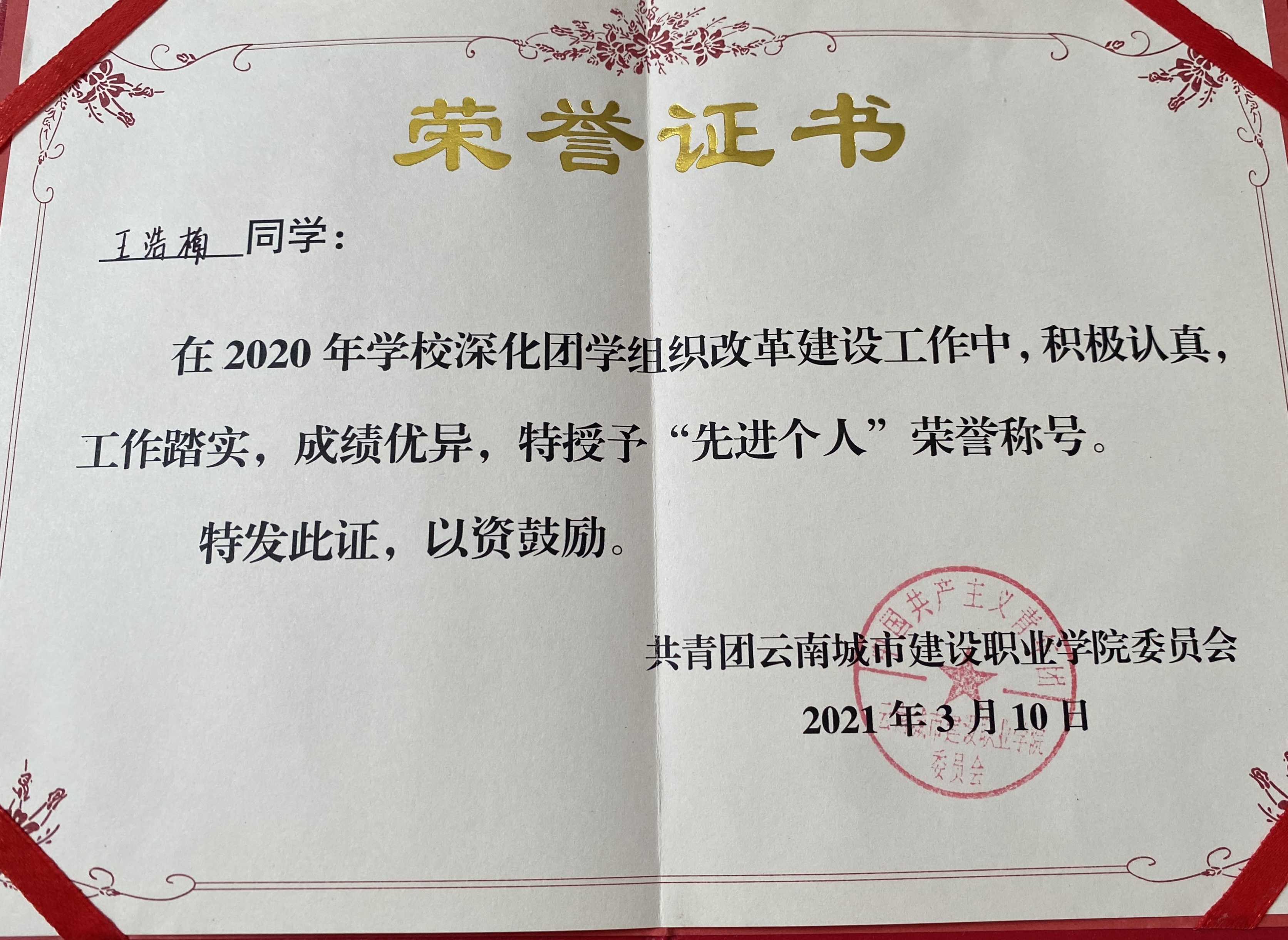 在校期间,他秉持严谨认真的学习态度,课上专注理论学习,实训中打磨实操,将知识转化为实践能力,学习成绩始终名列前茅。作为班级团支书,他认真履行学生干部的职责,心系集体,热心服务班级同学,积极协助老师处理班级事务,在个人进步与集体服务中展现出良好的责任感。