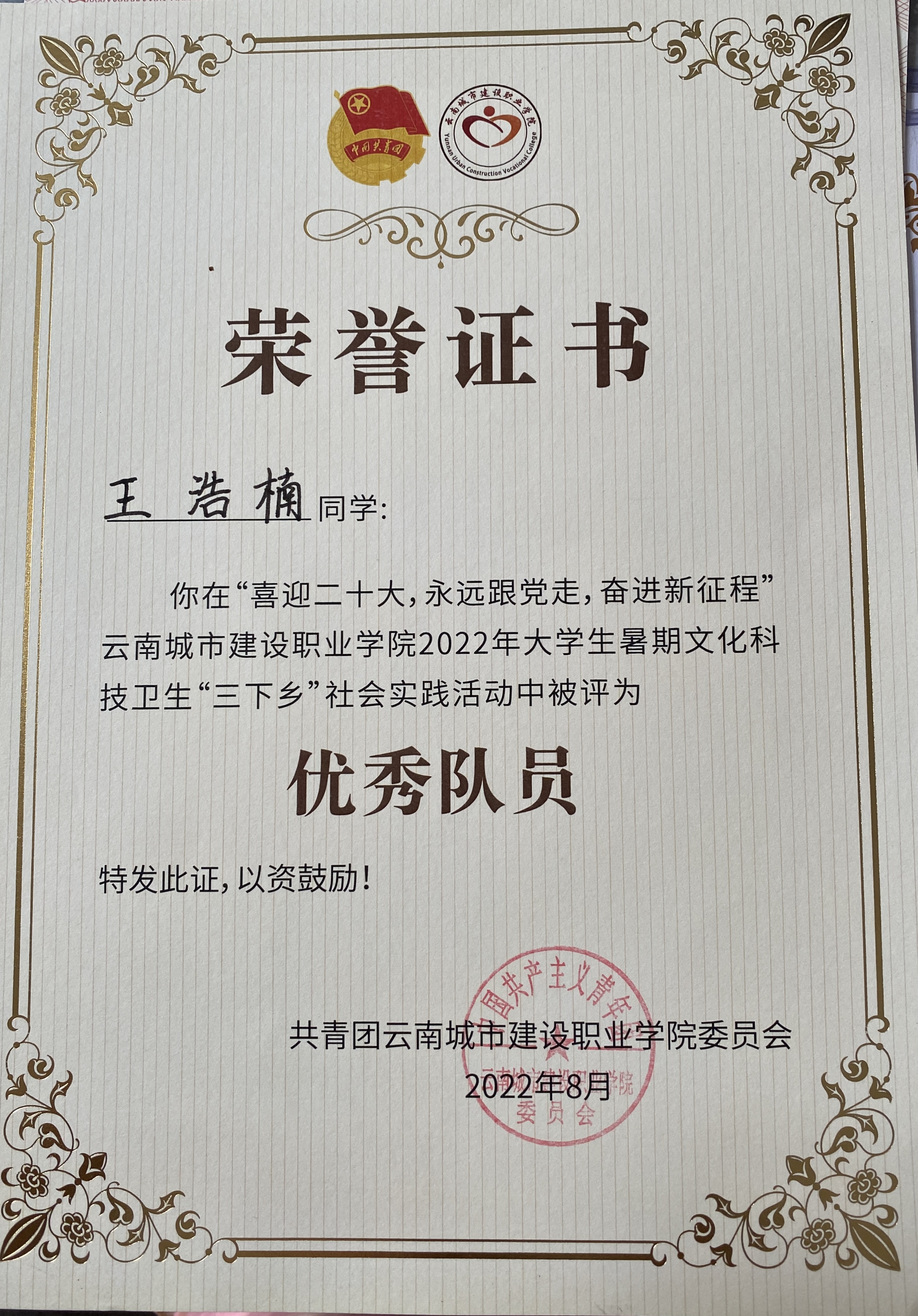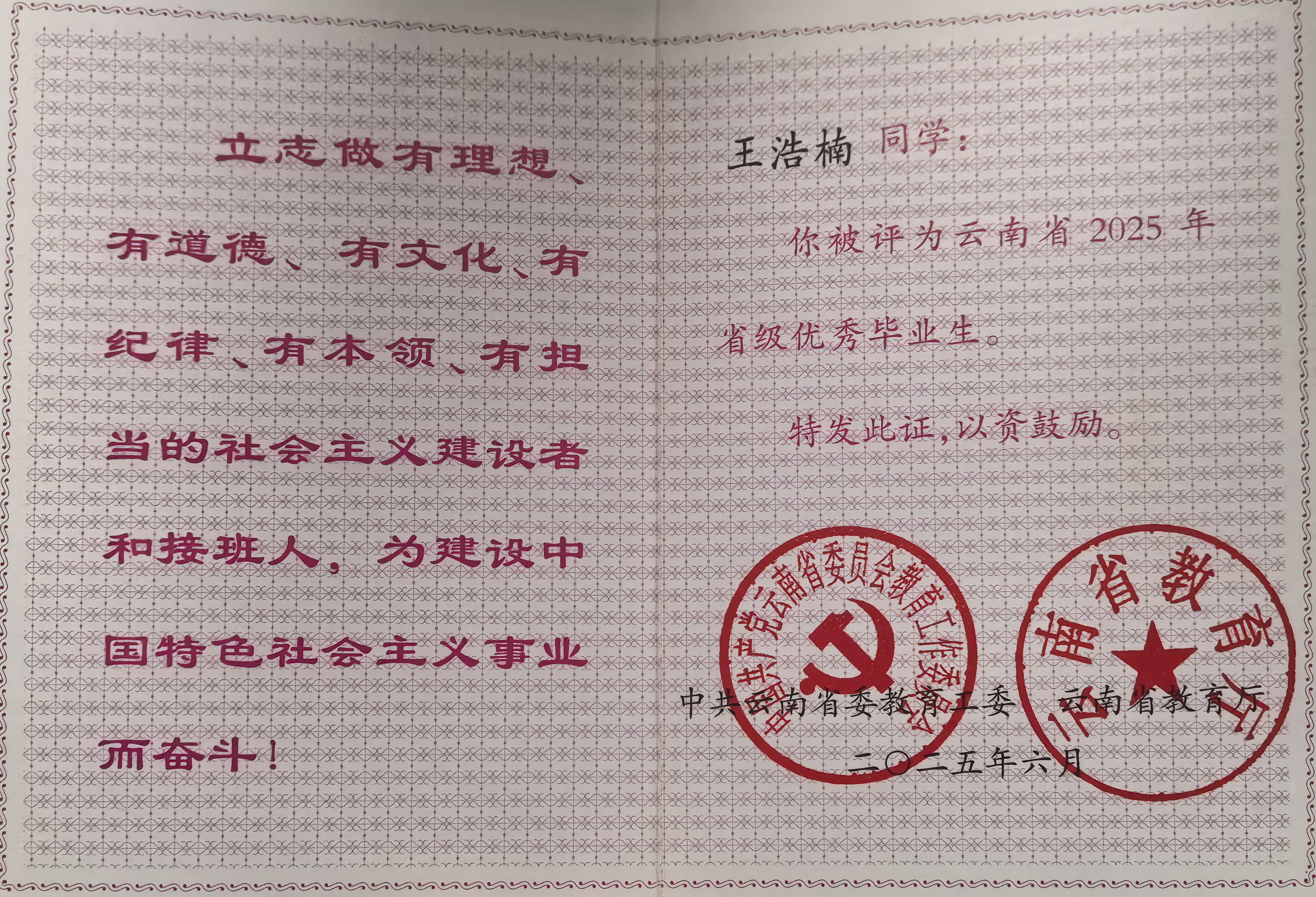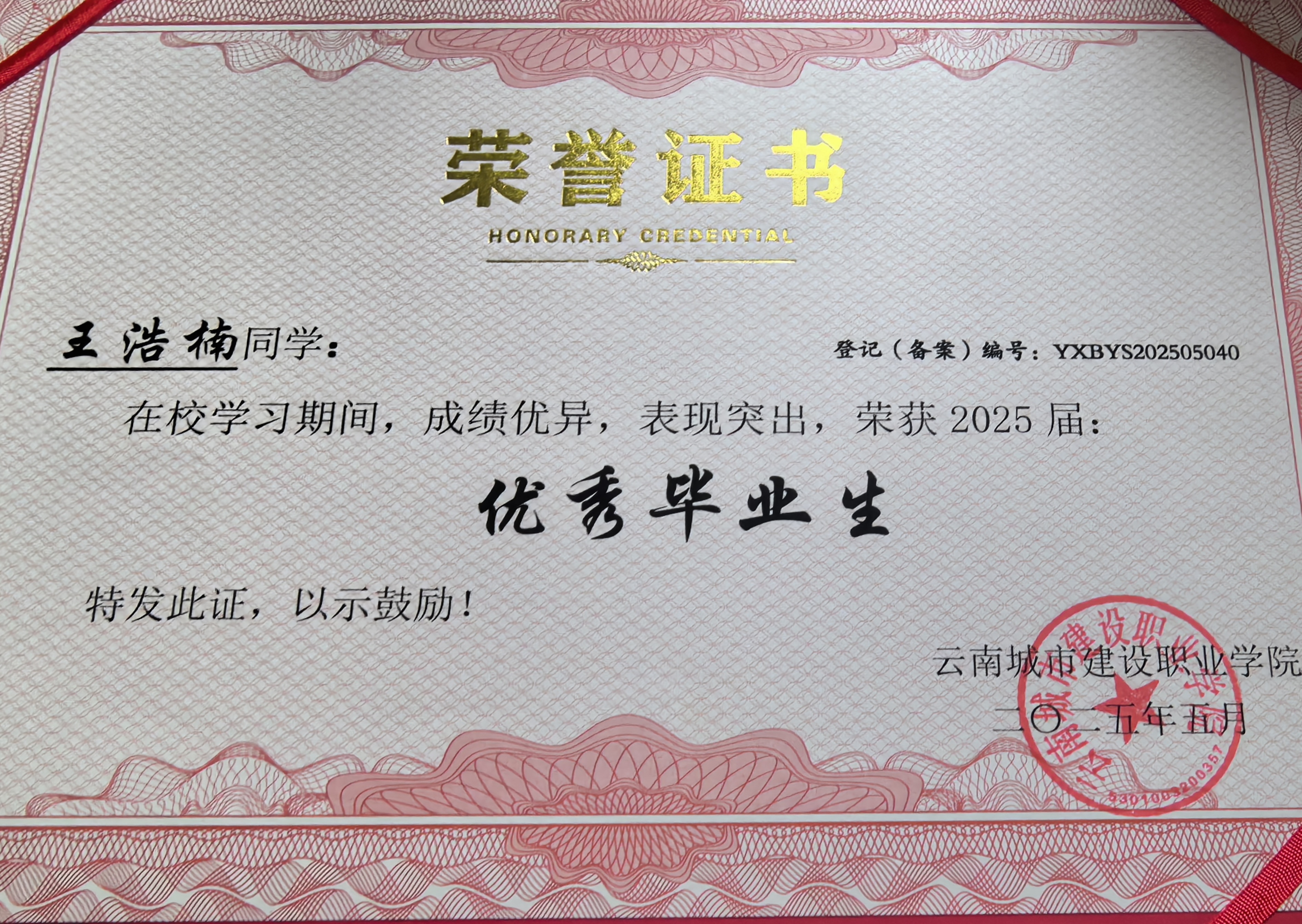 王浩楠,中共党员,学校数智城市学院2025届建筑工程技术专业毕业生,荣获云南省优秀毕业生称号,2025年应征入伍,现服役于中国人民解放军信息支援某部。